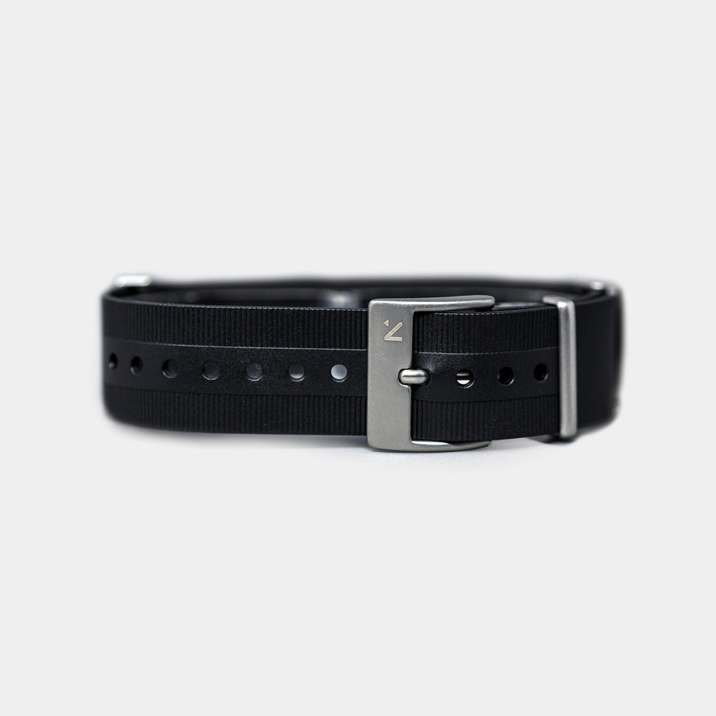 This NBR compound rubber performance strap is 100% vegan and toughened to withstand the most active outdoor and ocean pursuits. The classic NATO-style strap comes with pre-punched holes, and a secondary strap for added comfort and support.