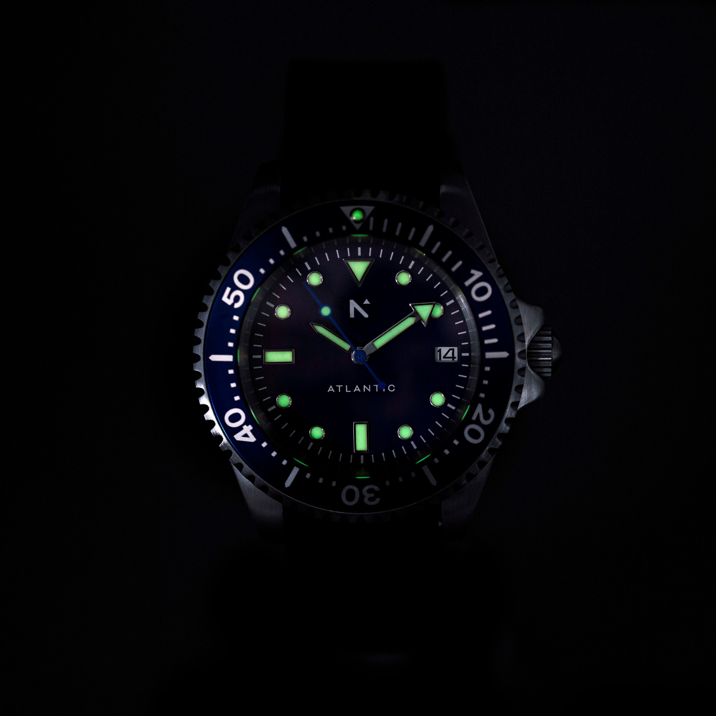 The benchmark for a true diver’s watch is water resistance to 30 ATM (300 metres) and the Atlantic meets this specification. To achieve a water resistance rating of 300m the 316L stainless steel case is fitted with a pressurised screw-down caseback and guarded screw-down crown.